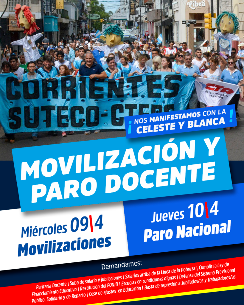 El Sindicato Único de Trabajadores de la Educación de Corrientes (SUTECO) adhiere al Paro Nacional Docente del jueves 10 de abril y a la jornada de movilización del miércoles 9 de abril; convocado por la Confederación de Trabajadores de la Educación de la República Argentina (CTERA).